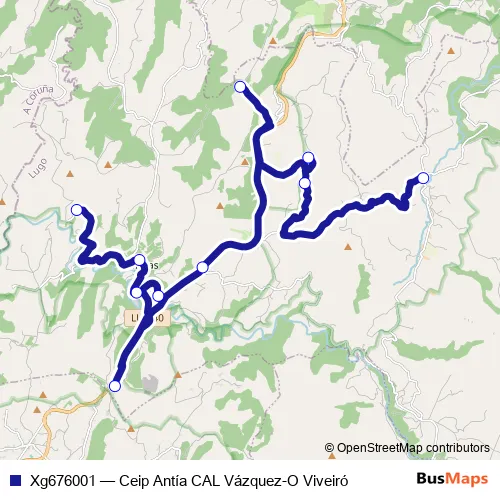 The first stop of the Xg676001 bus route is O Viveiró and the last stop is Ceip Antía CAL Vázquez. Xg676001 (Ceip Antía CAL Vázquez-O Viveiró) is operational during entre semana.