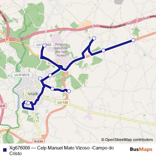 The first stop of the Xg676008 bus route is Campo DO Cristo and the last stop is Ceip Manuel Mato Vizoso. Xg676008 (Ceip Manuel Mato Vizoso -Campo do Cristo) is operational during entre semana.