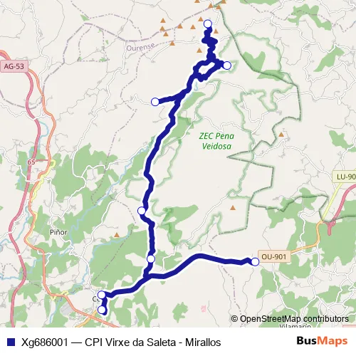 The first stop of the Xg686001 bus route is Mirallos and the last stop is CPI Virxe da Saleta. Xg686001 (CPI Virxe da Saleta - Mirallos) is operational during entre semana.