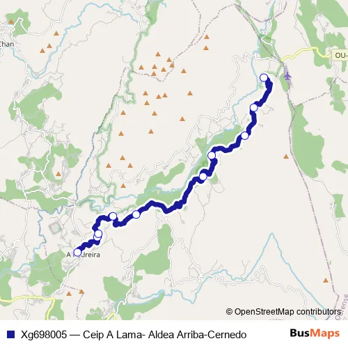 The first stop of the Xg698005 bus route is Ceip A Lama and the last stop is Aldea Arriba-Cernedo. Xg698005 (Ceip A Lama- Aldea Arriba-Cernedo) is operational during entre semana.