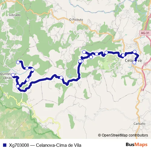 The first stop of the Xg703008 bus route is Celanova and the last stop is Cima DE Vila. Xg703008 (Celanova-Cima de Vila) is operational during entre semana.