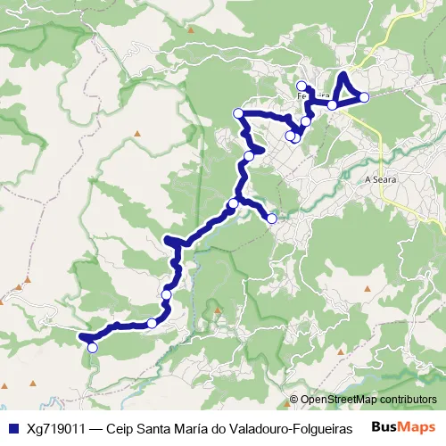 The first stop of the Xg719011 bus route is Ceip Santa María do Valadouro and the last stop is Folgueiras. Xg719011 (Ceip Santa María do Valadouro-Folgueiras) is operational during entre semana.
