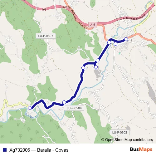 The first stop of the Xg732006 bus route is Baralla and the last stop is Covas (cruce Lebruxo). Xg732006 (Baralla - Covas) is operational during entre semana.
