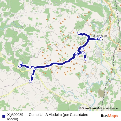 The first stop of the Xg800039 bus route is Cerceda and the last stop is A Abeleira. Xg800039 (Cerceda - A Abeleira (por Casaldabre Medio)) is operational during entre semana.
