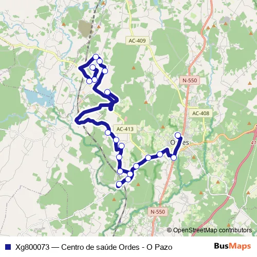 The first stop of the Xg800073 bus route is O Pazo and the last stop is Centro saude Ordes. Xg800073 (Centro de saúde Ordes - O Pazo) is operational during entre semana.