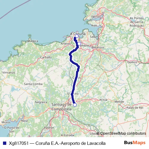 The first stop of the Xg817051 bus route is Aeroporto De Labacolla and the last stop is Coruña E.A.. Xg817051 (Coruña E.A.-Aeroporto de Lavacolla) is operational during todos los días.