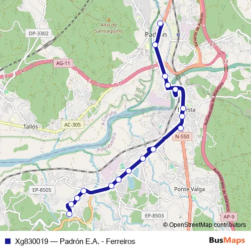 The first stop of the Xg830019 bus route is Padrón E.A. and the last stop is Ferreiros. Xg830019 (Padrón E.A. - Ferreiros) is operational during todos los días.