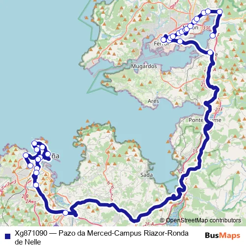The first stop of the Xg871090 bus route is Ronda De Nelle and the last stop is Pazo DA Merced. Xg871090 (Pazo da Merced-Campus Riazor-Ronda de Nelle) is operational during entre semana.