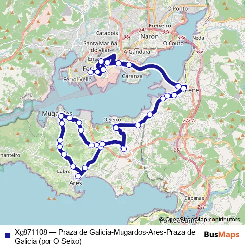 The first stop of the Xg871108 bus route is Plaza de Galicia and the last stop is Plaza de Galicia. Xg871108 (Praza de Galicia-Mugardos-Ares-Praza de Galicia (por O Seixo)) is operational during entre semana.