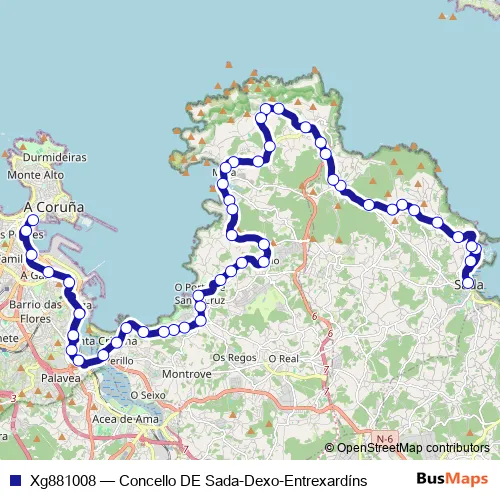 The first stop of the Xg881008 bus route is Concello DE Sada and the last stop is Entrexardíns. Xg881008 (Concello DE Sada-Dexo-Entrexardíns) is operational during entre semana.