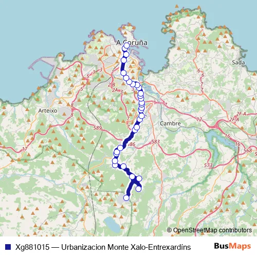 The first stop of the Xg881015 bus route is Urbanizacion Monte Xalo and the last stop is Entrexardíns. Xg881015 (Urbanizacion Monte Xalo-Entrexardíns) is operational during entre semana.