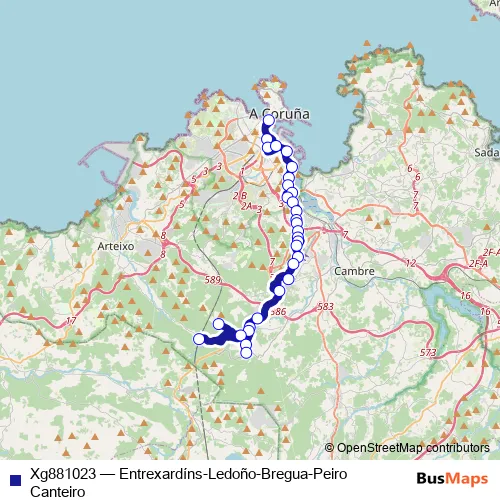 The first stop of the Xg881023 bus route is Entrexardíns and the last stop is Peiro Canteiro. Xg881023 (Entrexardíns-Ledoño-Bregua-Peiro Canteiro) is operational during entre semana.