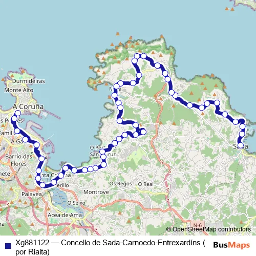 The first stop of the Xg881122 bus route is Concello DE Sada and the last stop is Entrexardíns. Xg881122 (Concello de Sada-Carnoedo-Entrexardíns (por Rialta)) is operational during todos los días.