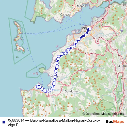 The first stop of the Xg883014 bus route is Vigo E.I. and the last stop is Baiona. Xg883014 (Baiona-Ramallosa-Mallon-Nigran-Coruxo-Vigo E.I) is operational during todos los días.