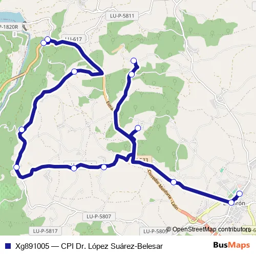 The first stop of the Xg891005 bus route is Belesar and the last stop is CPI DR. López Suárez. Xg891005 (CPI Dr. López Suárez-Belesar) is operational during entre semana.