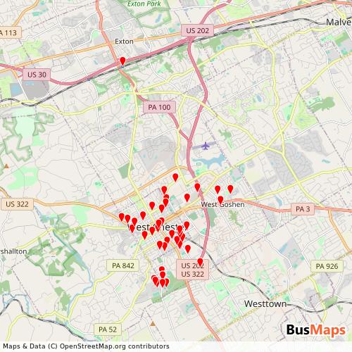 Transit map showing west-chester-univ-fixed-route routes and stops in United States