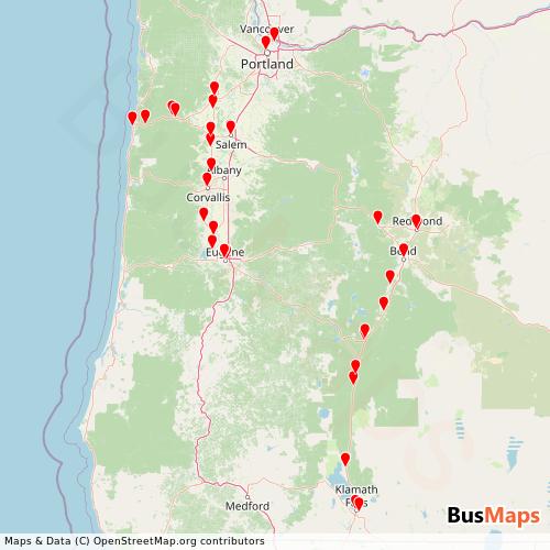 Pacific Crest Bus Lines operates in the following cities: Eugene, Klamath Falls, Portland, Redmond, Salem.