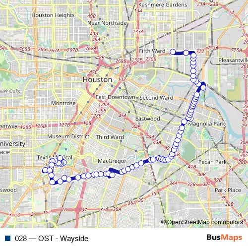 The first stop of the 028 bus route is Ben Taub Loop @ Cambridge St and the last stop is Fifth Ward/Denver Harbor Transit Center. 028 (OST - Wayside) is operational during todos los días.