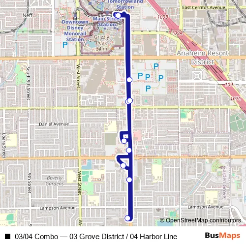 The first stop of the 03/04 Combo bus route is Disneyland Main Transportation Center - 03 and the last stop is Disneyland Main Transportation Center - 03. 03/04 Combo (03 Grove District / 04 Harbor Line) is operational during todos los días.
