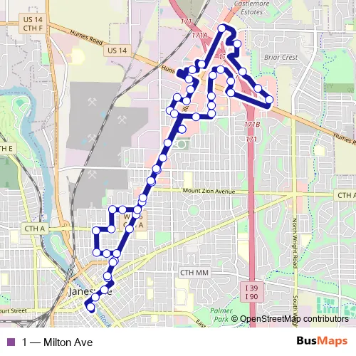 See why over 2 million users trust and consider busmaps.com as the best public transport website. busmaps gives you Janesville Buses suggested routes, real-time bus tracker, line route maps in Janesville, and helps to find the closest 1 bus stops near you. No internet available? Download an offline PDF map and bus schedule for the 1 bus to take on your trip.