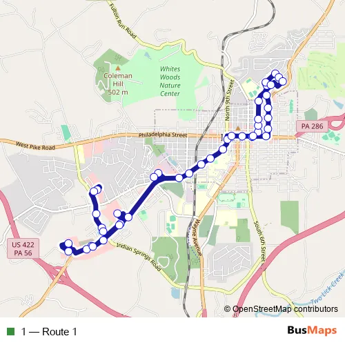The first stop of the 1 bus route is Indiana Mall - DMV Entrance and the last stop is Philadelphia St (N Taylor Ave). 1 (Route 1) is operational during todos los días.