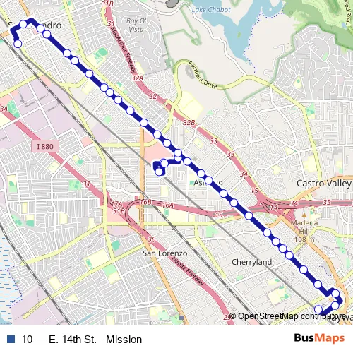 The first stop of the 10 bus route is Hayward Bart and the last stop is San Leandro Bart. 10 (E. 14th St. - Mission) is operational during todos los días.