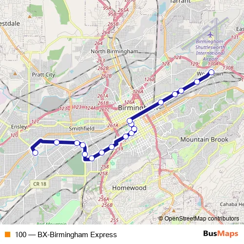 The first stop of the 100 bus route is Crossplex Transit Center and the last stop is Woodlawn Transit Center. 100 (BX-Birmingham Express) is operational during todos los días.