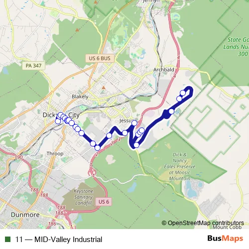 The first stop of the 11 bus route is Giant Dickson and the last stop is Jessup Park AND Rid. 11 (MID-Valley Industrial) is operational during todos los días.