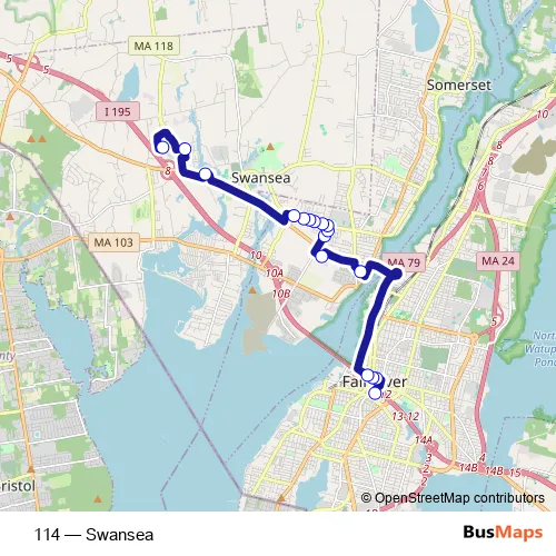 The first stop of the 114 bus route is Srta Fall River Terminal and the last stop is Swansea Walmart. 114 (Swansea) is operational during todos los días.