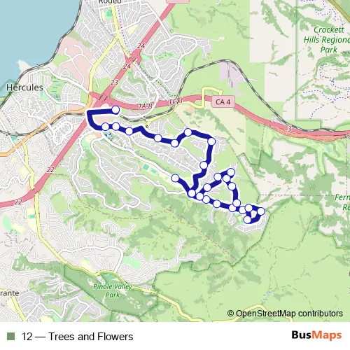 The first stop of the 12 bus route is Hercules Middle and High School and the last stop is Hercules Transit Center. 12 (Trees and Flowers) is operational during entre semana.