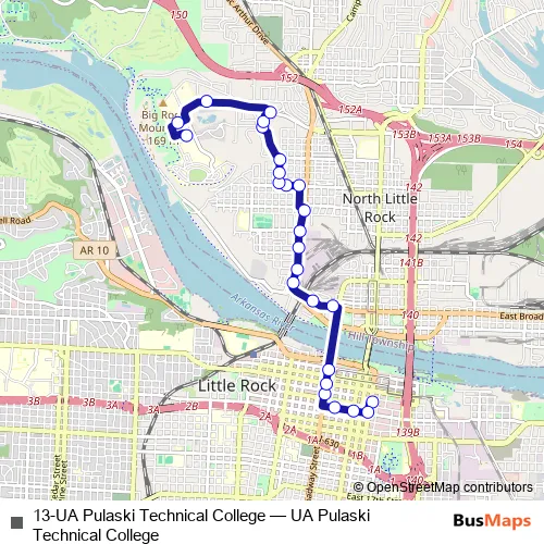 Additional information: 13-UA Pulaski Technical College has 25 stops and the total trip duration for this route is approximately 20 minutes.