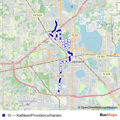 The first stop of the 15 bus route is Lakeside Village and the last stop is Lakeland Square Mall. 15 (Kathleen/Providence/Harden) is operational during entre semana.