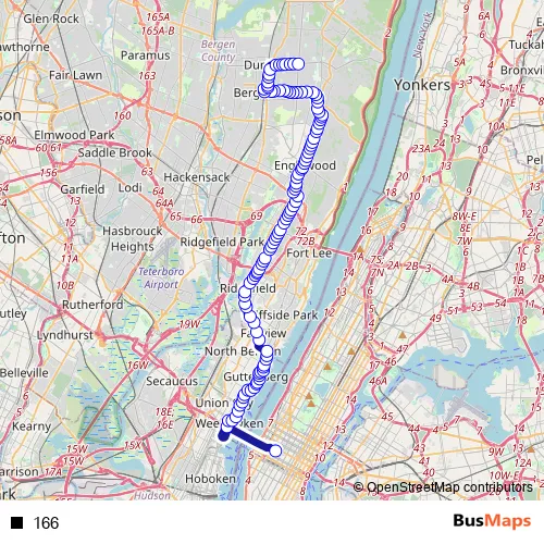 See why over 2 million users trust and consider busmaps.com as the best public transport website. busmaps gives you Hackensack Buses suggested routes, real-time bus tracker, line route maps in Hackensack, and helps to find the closest 166 bus stops near you. No internet available? Download an offline PDF map and bus schedule for the 166 bus to take on your trip.