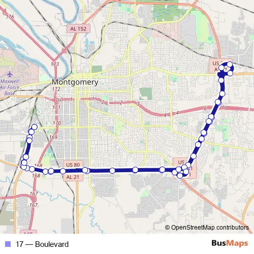 See why over 2 million users trust and consider busmaps.com as the best public transport website. busmaps gives you Montgomery Buses suggested routes, real-time bus tracker, line route maps in Montgomery, and helps to find the closest 17 bus stops near you. No internet available? Download an offline PDF map and bus schedule for the 17 bus to take on your trip.