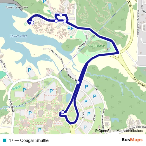 The first stop of the 17 bus route is Siue Peck Hall and the last stop is Siue Peck Hall. 17 (Cougar Shuttle) is operational during todos los días.