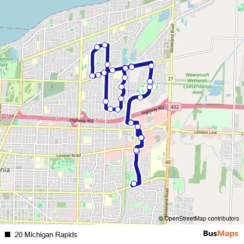 Additional information: 20 Michigan Rapids has 31 stops and the total trip duration for this route is approximately 40 minutes.
