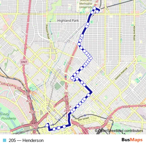 The first stop of the 205 bus route is CBD West Tc and the last stop is SMU/Mockingbird Station. 205 (Henderson) is operational during todos los días.