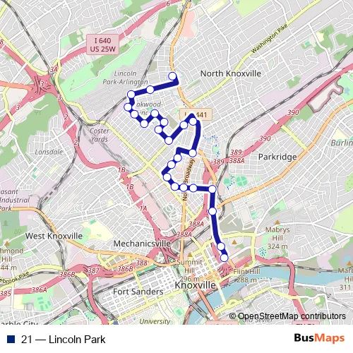 The first stop of the 21 bus route is Chickamauga at Broadway and the last stop is Knoxville Station Hall of Fame. 21 (Lincoln Park) is operational during todos los días.