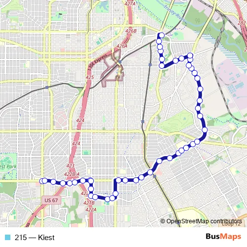 The first stop of the 215 bus route is Polk @ Kiest - N - Ns and the last stop is 8TH & Corinth Station. 215 (Kiest) is operational during todos los días.