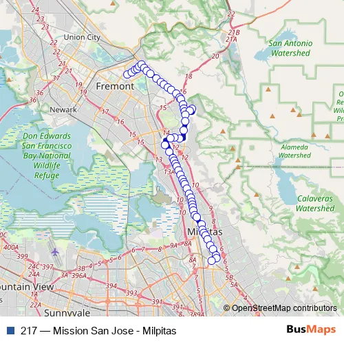 The first stop of the 217 bus route is Fremont Bart and the last stop is Milpitas Bart VTA Bay 9. 217 (Mission San Jose - Milpitas) is operational during todos los días.