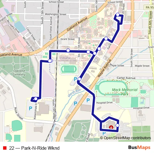 The first stop of the 22 bus route is IUP Robertshaw Bus Shelter and the last stop is IUP Robertshaw Bus Shelter. 22 (Park-N-Ride Wknd) is operational during los fines de semana.