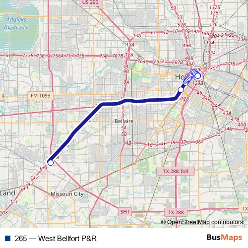 The first stop of the 265 bus route is West Bellfort Park & Ride and the last stop is Congress St @ La Branch St. 265 (West Bellfort P&R) is operational during entre semana.