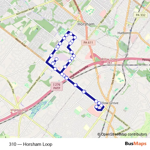 The first stop of the 310 bus route is Willow Grove Park Mall and the last stop is Willow Grove Park Mall. 310 (Horsham Loop) is operational during todos los días.