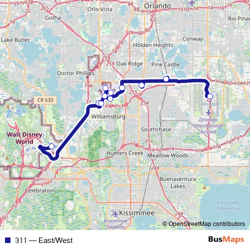 The first stop of the 311 bus route is E Buena Vista DR & Bonnet Creek Pkwy and the last stop is Orlando International Airport. 311 (East/West) is operational during todos los días.