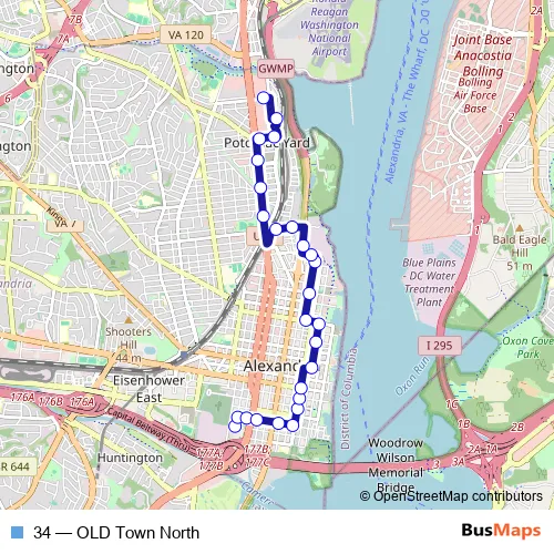 The first stop of the 34 bus route is Lee Center and the last stop is Potomac Yard Center. 34 (OLD Town North) is operational during todos los días.