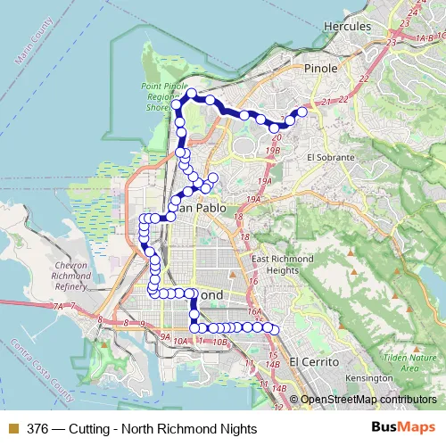 The first stop of the 376 bus route is Fitzgerald Dr & Best Buy and the last stop is Del Norte Bart Bay 6. 376 (Cutting - North Richmond Nights) is operational during todos los días.