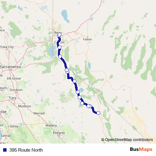 The first stop of the 395 Route North bus route is Bishop - Vons/Kmart, 1200 N. Main Street and the last stop is Reno - RTC Centennial Plaza Bay O - 1421 Victorian Avenue, Sparks, NV 89431. 395 Route North (395 Route North) is operational during todos los días.
