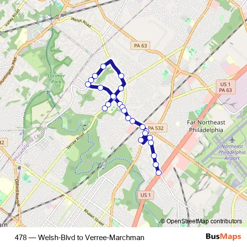 The first stop of the 478 bus route is Verree Rd & Marchman Rd - 2 Mbfs and the last stop is Welsh Rd & Roosevelt Blvd. 478 (Welsh-Blvd to Verree-Marchman) is operational during entre semana.