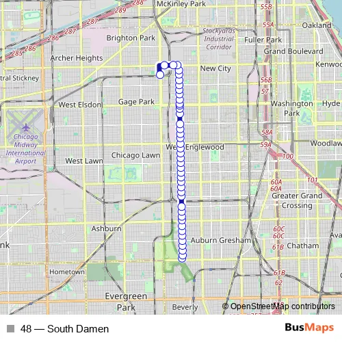 The first stop of the 48 bus route is Damen & 87th Street Terminal and the last stop is Western Orange Line Station. 48 (South Damen) is operational during entre semana.