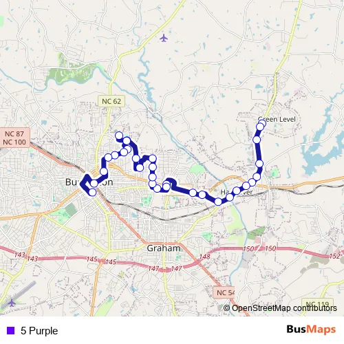 The first stop of the 5 Purple bus route is Yanceyville Road @ Dollar General and the last stop is Across from Burlington City Hall (Inbound). 5 Purple is operational during todos los días.